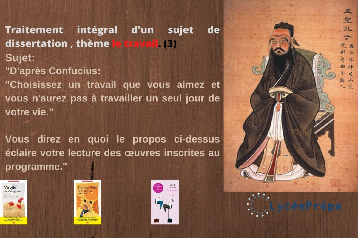 Sujet: « D’après Confucius: « Choisissez un travail que vous aimez et vous n’aurez pas à travailler un seul jour de votre vie. » Vous direz en quoi le propos ci-dessus éclaire votre lecture des œuvres inscrites au programme. » Analyse de la citation La citation Objet d’analyse se compose de deux phrases : la…